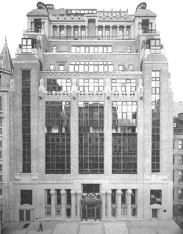 In its transformation to the PYTHIAN CONDOMINIUMS, most of the ornamentation was retained. Eighty-four condominium apartments plus four professional office suites on the ground floor were inserted into the former lodge floors. The existing structural frame, different on every floor, has for all intents and purposes been retained unchanged. New duplex apartments were threaded throughout the old trusses and inserted between the existing floor slabs. New floor slabs trisect the old auditorium space. New windows were added in a manner that reveals both the original construction and new renovation. Gold reflective curtain wall with deep red-colored framing members are split at the fifth floor, providing terraces for bedrooms on that level and showing both how the mass above is suspended on trusses and how the original five-bay architectural facade was overlaid on a six-bay structural frame. All code requirements were met with a sophisticated water-to-air heat pump system for climate control and double-glazing for all windows, including the eighth and ninth floor solaria. Decorative elements on the southern facade were either retained in place and restored or salvaged for use elsewhere within the building. The aim of the project thus achieved provides modern, comfortable living quarters within an old structure in such a way that the essence of the original building was not only retained but also enriched. As completed, the PYTHIAN CONDOMINIUMS received a Residential Design Award from the New York Chapter of the American Institute of Architects. The individual layouts of the apartments, each one different, and the sensitivity with which the older building elements have been combined with the new, were the subject of several articles prepared for major publications.