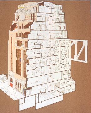deep within the building. Covering the ziggurat-like stepped mass, more